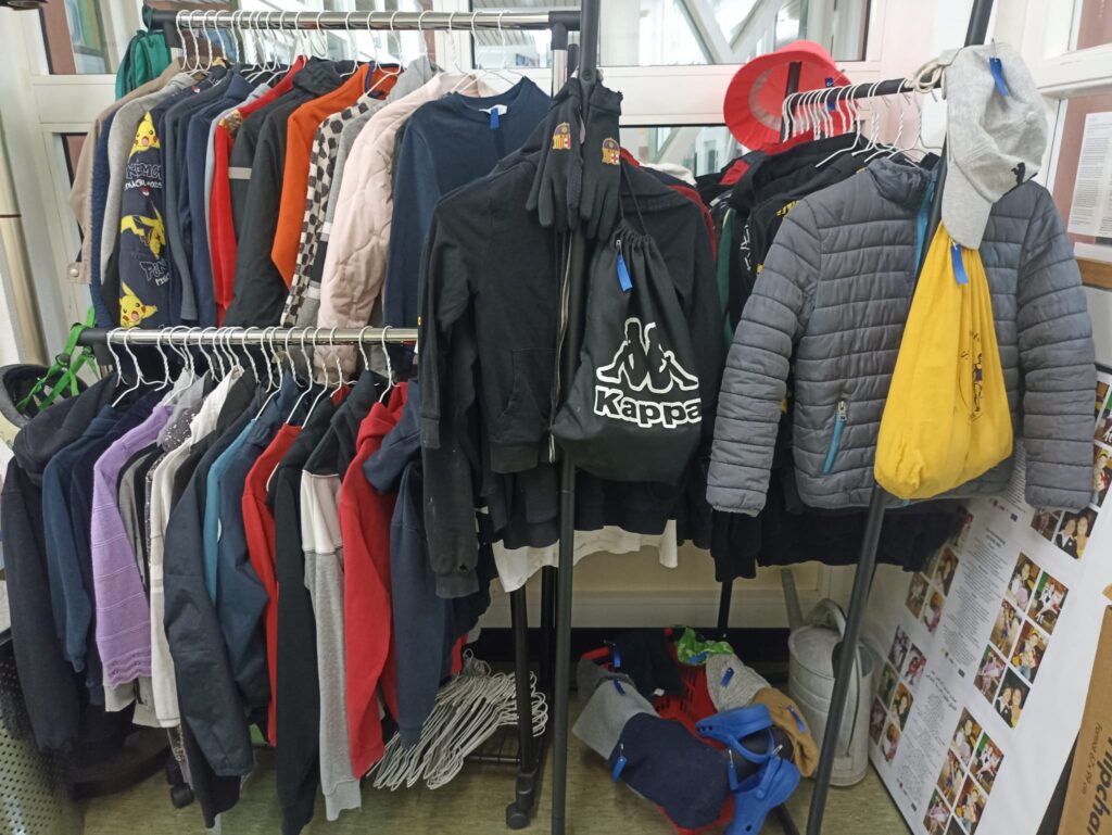 Die Fundsachen unter der Treppe vor dem Container wurden heute ins Elterncafé gebracht. Sie sind nun alle ordentlich auf Bügeln, so dass sie trocknen können.